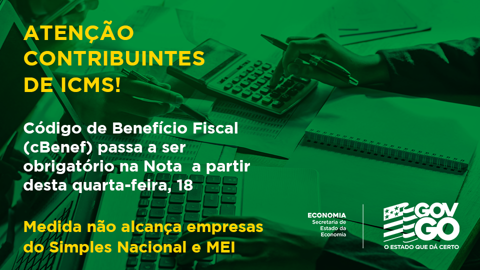 A Secretaria da Economia informa que a partir desta quarta-feira (18/10) as empresas do Estado de Goiás que possuem qualquer tipo de benefício fiscal deverão preencher na Nota Fiscal Eletrônica ou Nota Fiscal do Consumidor Eletrônica (NFC-e), o campo “cBenef” com o respectivo código previsto na Tabela de Códigos de Benefícios Fiscais que consta na Instrução Normativa 1.518/22-GSE, de 03 de fevereiro de 2022.
