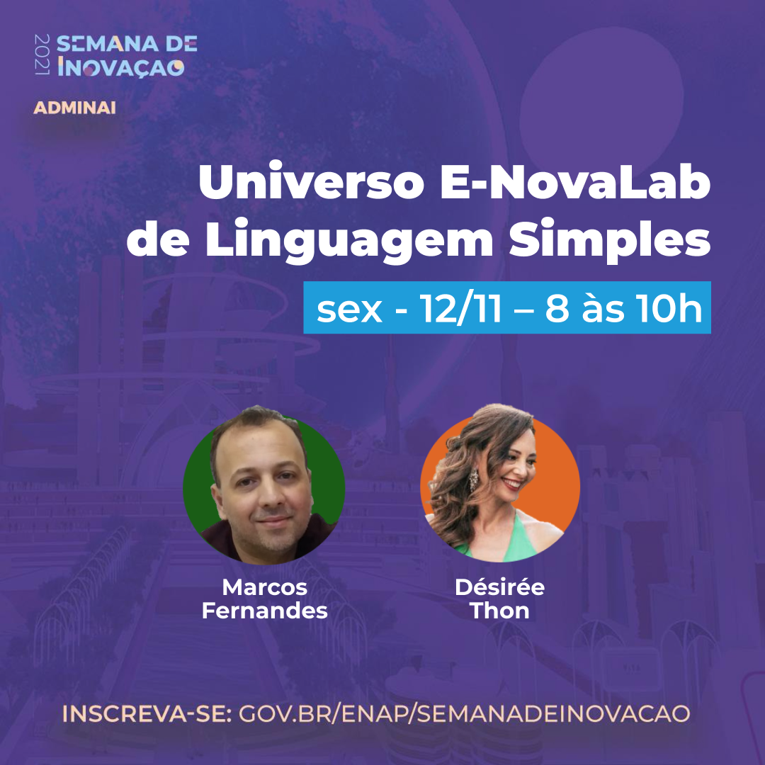 O Laboratório de Inovação e Dados da Secretaria da Economia (E-NOVA) vai apresentar, nesta sexta-feira (12/11), sua metodologia de Linguagem Simples durante a Semana de Inovação 2021. É o maior evento de inovação em governo da América Latina, promovido pela Escola Nacional de Administração Pública (ENAP) e Ministério da Economia.