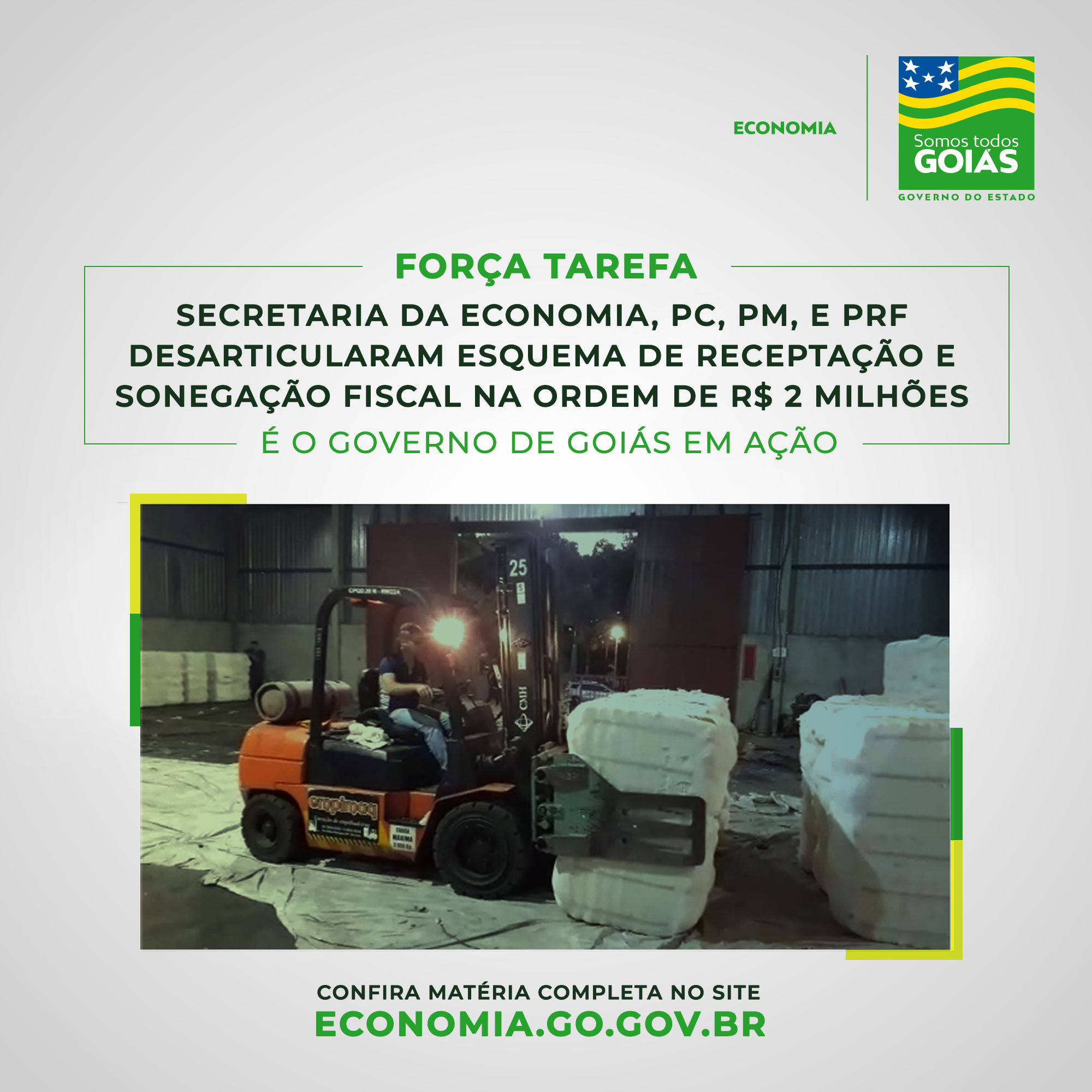 Auditores da Delegacia Regional de Fiscalização de Goiânia (DRF), da Secretaria da Economia, participaram no último final de semana, de operação conjunta com a Delegacia Estadual de Repressão a Furtos e Roubos de Cargas (Decar), e as Polícias Militar e Rodoviária Federal para desarticular esquema de receptação e sonegação fiscal. A ação recuperou uma carga roubada de algodão em pluma para exportação. Na parte fiscal, as notas fraudulentas utilizadas pelos suspeitos geraram autuações superiores a R$ 2 milhões em ICMS e multa.