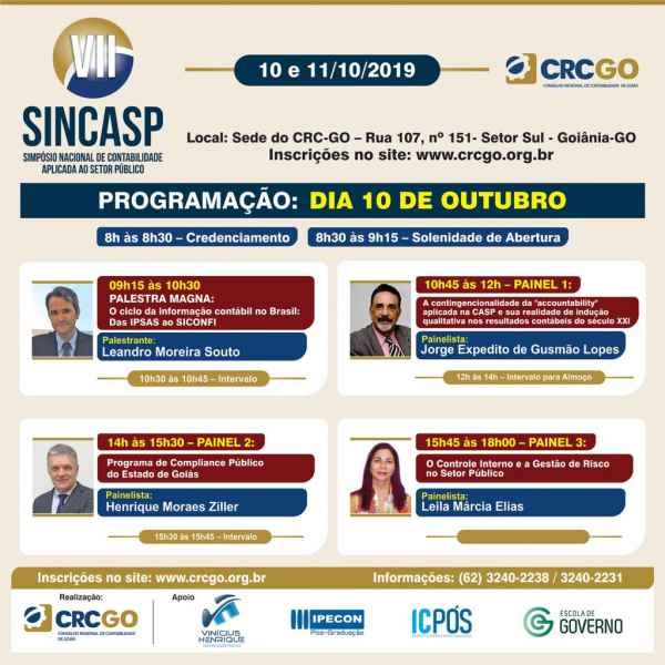 Nos dias 10 e 11 de outubro será realizado em Goiânia o VII Simpósio Nacional de Contabilidade Aplicada ao Setor Público de Goiás (SINCASP). De acordo com o coordenador regional do evento, o superintendente da Contabilidade-Geral (SCG) do Estado Ricardo Borges, as inscrições seguem enquanto houver vagas.O evento será no auditório da sede o Conselho Regional de Contabilidade (CRC), no setor Sul.
