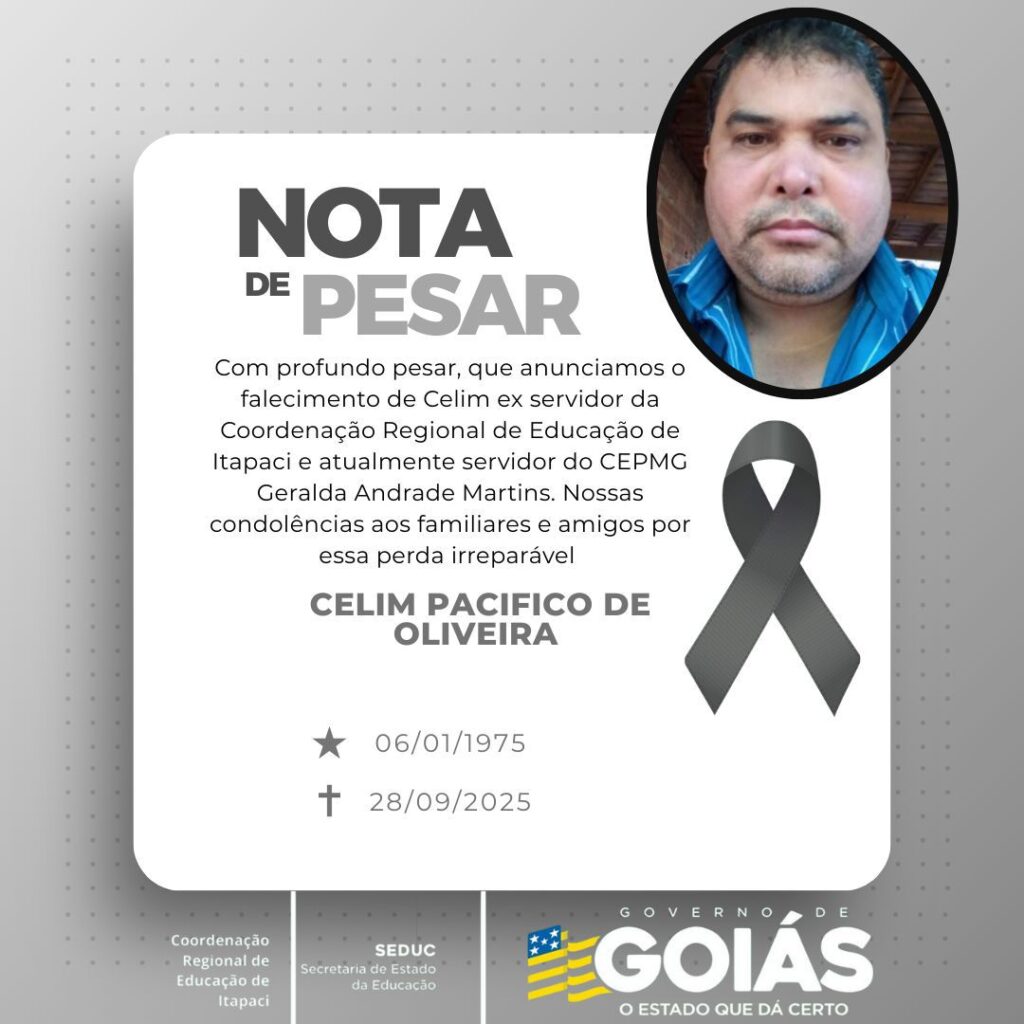 A Secretaria de Estado da Educação de Goiás (Seduc/GO) manifesta profundo pesar pelo falecimento do servidor Celim Pacífico de Oliveira, ocorrido em decorrência de um infarto.