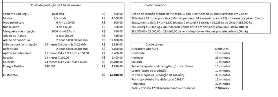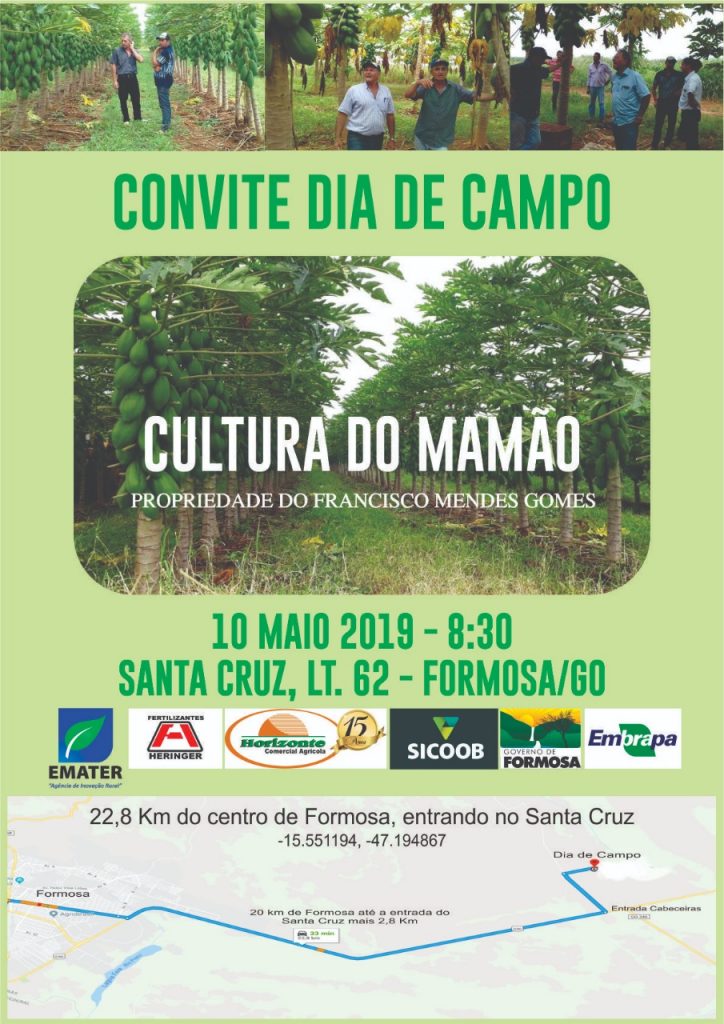 O Dia de Campo irá demostrar os resultados da implantação, no local, de 1 hectare do Mamão Formosa variedade Tainung. A fruta foi objeto de estudo durante 8 meses em pesquisa desenvolvida em parceria pela Emater, Embrapa Cerrado, Heringer e Horizonte. Os resultados mostrados no evento serão a viabilidade do mamão, os custos de produção, as melhores formas para produção e condições da região.