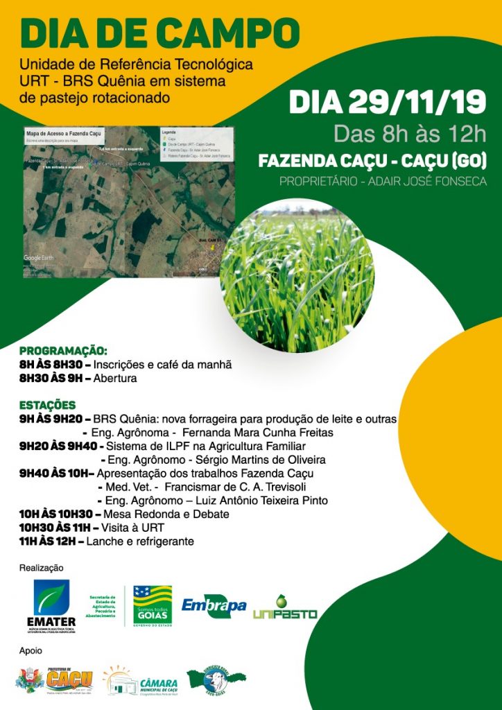 Em mais uma edição do Dia de Campo, o Governo de Goiás, por meio da Agência Goiana de Assistência Técnica, Extensão Rural e Pesquisa Agropecuária (Emater), irá promover um debate sobre pastejo rotacionado com BRS Quênia, uma variedade de capim desenvolvida pela Empresa Brasileira de Pesquisa Agropecuária (Embrapa). O evento acontece nesta sexta-feira (29), às 8h da manhã, em Caçu, município localizado na região sul de Goiás.