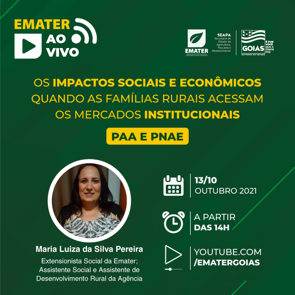 A próxima live organizada pela Agência Goiana de Assistência Técnica, Extensão Rural e Pesquisa Agropecuária (Emater) irá debater os impactos sociais e econômicos decorrentes do acesso de agricultores familiares aos mercados institucionais. A palestra será transmitida na quarta-feira (13), às 14 horas, pelo Emater Ao Vivo, programa semanal exibido no canal da instituição no YouTube.