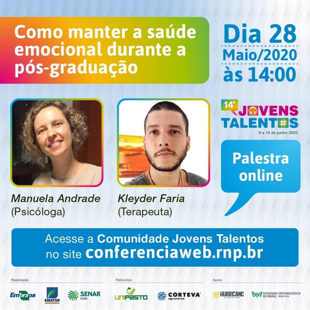 Cuidados com a saúde emocional durante a pós-graduação é o tema da próxima live realizada pela Empresa Brasileira de Pesquisa Agropecuária (Embrapa), em parceria com o Governo de Goiás, por meio da Agência Goiana de Assistência Técnica, Extensão Rural e Pesquisa Agropecuária (Emater), e o Serviço Nacional de Aprendizagem Rural (Senar). A ação, que faz parte do 14º Seminário Jovens Talentos, acontecerá no próximo dia 28 de maio, às 14h, no Portal Conferência Web.