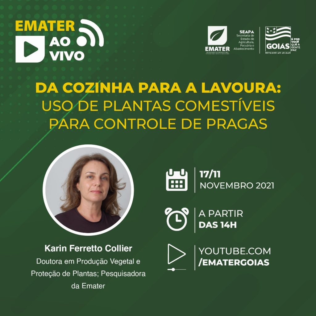 A próxima palestra virtual transmitida pela Agência Goiana de Assistência Técnica, Extensão Rural e Pesquisa Agropecuária (Emater) irá mostrar como as plantas comestíveis podem ser utilizadas no manejo de pragas. A live será exibida nesta quarta-feira (20), a partir das 14h, pelo Emater ao Vivo, programa semanal disponível no canal da instituição no YouTube.