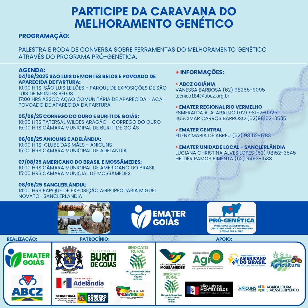A gestora dos programas de pecuária da Emater Goiás, zootecnista Elieny Abreu, especialista em produção de ruminantes, destaca que a caravana é uma oportunidade para desmistificar conceitos sobre melhoramento genético e capacitar os produtores na adoção de práticas que resultem em mais produtividade e renda.