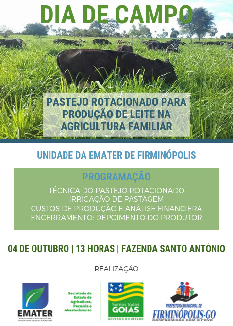 A Agência Goiana de Assistência Técnica, Extensão Rural e Pesquisa Agropecuária (Emater) irá realizar, nesta sexta-feira (04), uma edição do Dia de Campo, na Fazenda Santo Antônio, propriedade assistida pela entidade no município de Firminópolis.