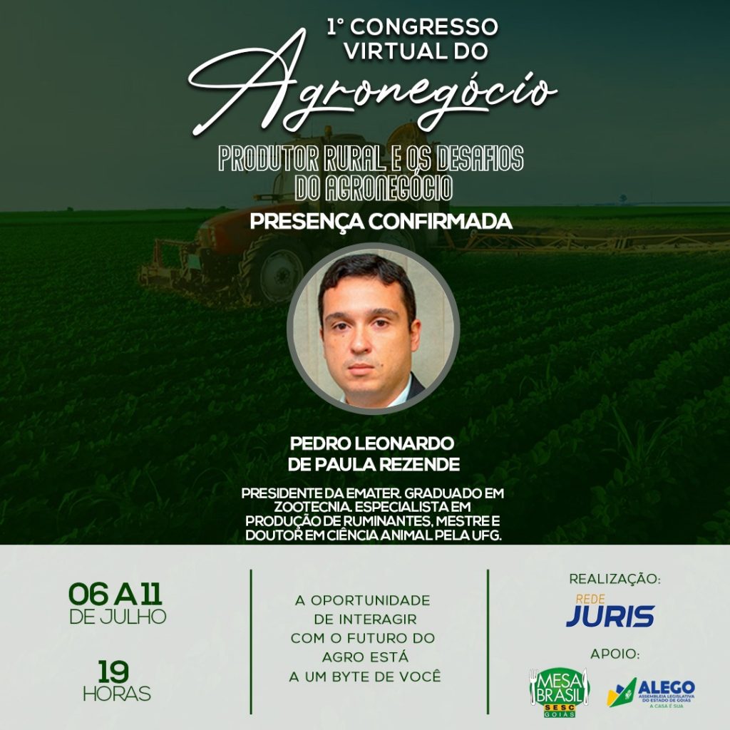 O presidente da Agência Goiana de Assistência Técnica, Extensão Rural e Pesquisa Agropecuária (Emater), Pedro Leonardo Rezende, irá participar do painel “Produtor Rural e os Desafios do Agronegócio”, no 1º Congresso Virtual do Agronegócio. O evento, promovido pela Rede Juris, acontecerá entre os dias 06 e 11 de julho, com toda a programação realizada por meio de plataforma online.