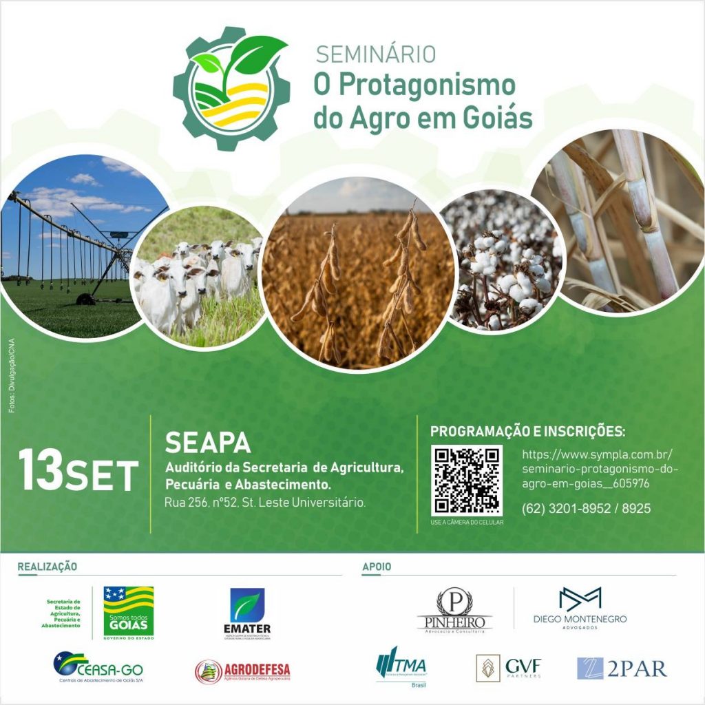 Estão abertas as inscrições para o Seminário “O Protagonismo do Agro em Goiás”, que irá acontecer no próximo dia 13 de setembro. O evento é uma realização do Governo de Goiás, por meio da Agência Goiana de Assistência Técnica, Extensão Rural e Pesquisa Agropecuária (Emater) e Secretaria de Estado de Agricultura, Pecuária e Abastecimento (Seapa), em parceria com as Centrais de Abastecimento de Goiás (Ceasa) e a Agência Goiana de Defesa Agropecuária (Agrodefesa).
