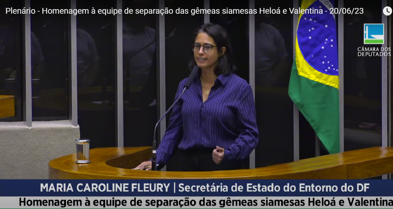 Representando o governador de Goiás, Ronaldo Caiado, a secretária do Entorno do Distrito Federal, Carol Fleury, participou na manhã desta terça-feira (20/6), na Câmara Federal, de homenagem à equipe multiprofissional que realizou a separação das gêmeas siamesas Eloá e Valentina, em 11 de janeiro deste ano, no Hospital Estadual da Criança e do Adolescente (Hecad). A cirurgia de alta complexidade, concluída com sucesso, é mais um caso de referência em Goiás.