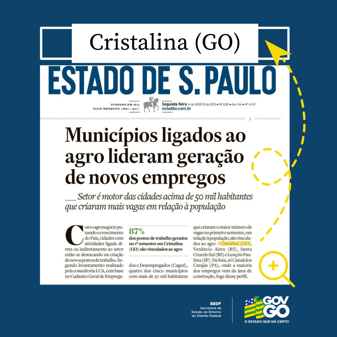 Cristalina, na região do Entorno do Distrito Federal, foi destaque no jornal Estadão nesta semana por conta da criação de vagas de trabalho ligadas ao setor agropecuário. Segundo o jornal, em Cristalina, foram abertas quase 3,5 mil vagas, o que equivale a 5,6% do total de habitantes no município. Deste total de novos postos, 87% estão ligados diretamente ao cultivo de soja e outras oleaginosas.
