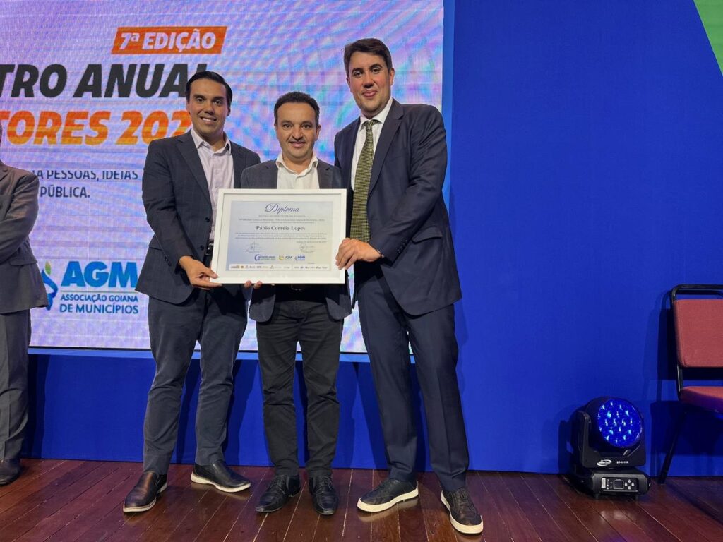 A honraria a Pábio Mossoró foi entregue pelos presidentes anfitriões das entidades municipalistas, Paulo Vitor Avelar, da FGM, e Zé Délio, da AGM, em meio a uma programação que reuniu autoridades de todo o estado e consolidou o encontro como o principal fórum municipalista de Goiás.