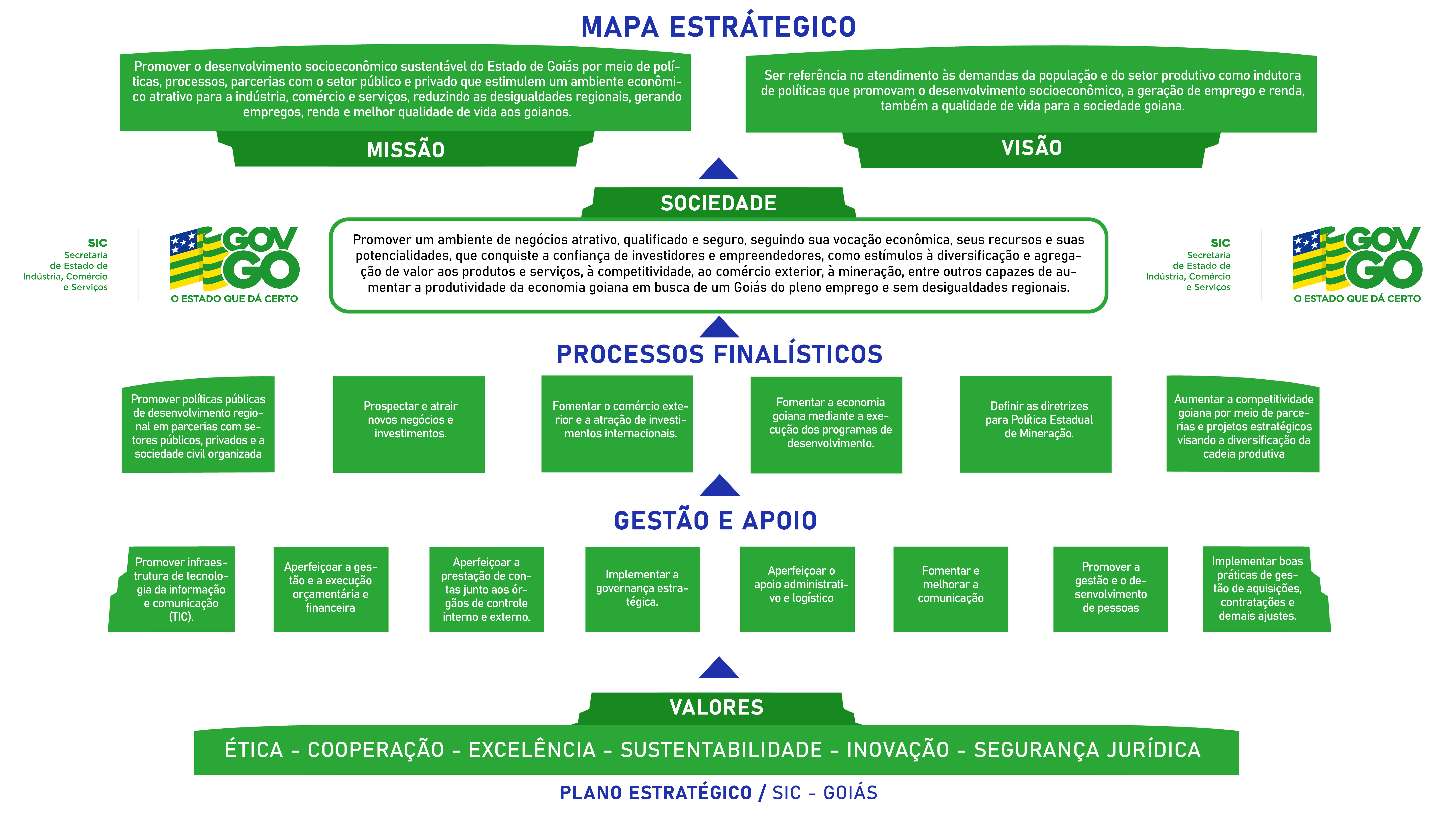 Portanto, desenvolver estratégicas ligadas ao fomento de pequenos, médios e grandes empreendimentos no território goiano, bem como desenvolver a implantação e a execução de uma política arrojada de incentivo à exportação, de atração de novos empreendedores e ampliação dos empreendimentos já existentes é a premissa principal de atuação da SIC, sendo isso expresso em sua missão, visão e valores.