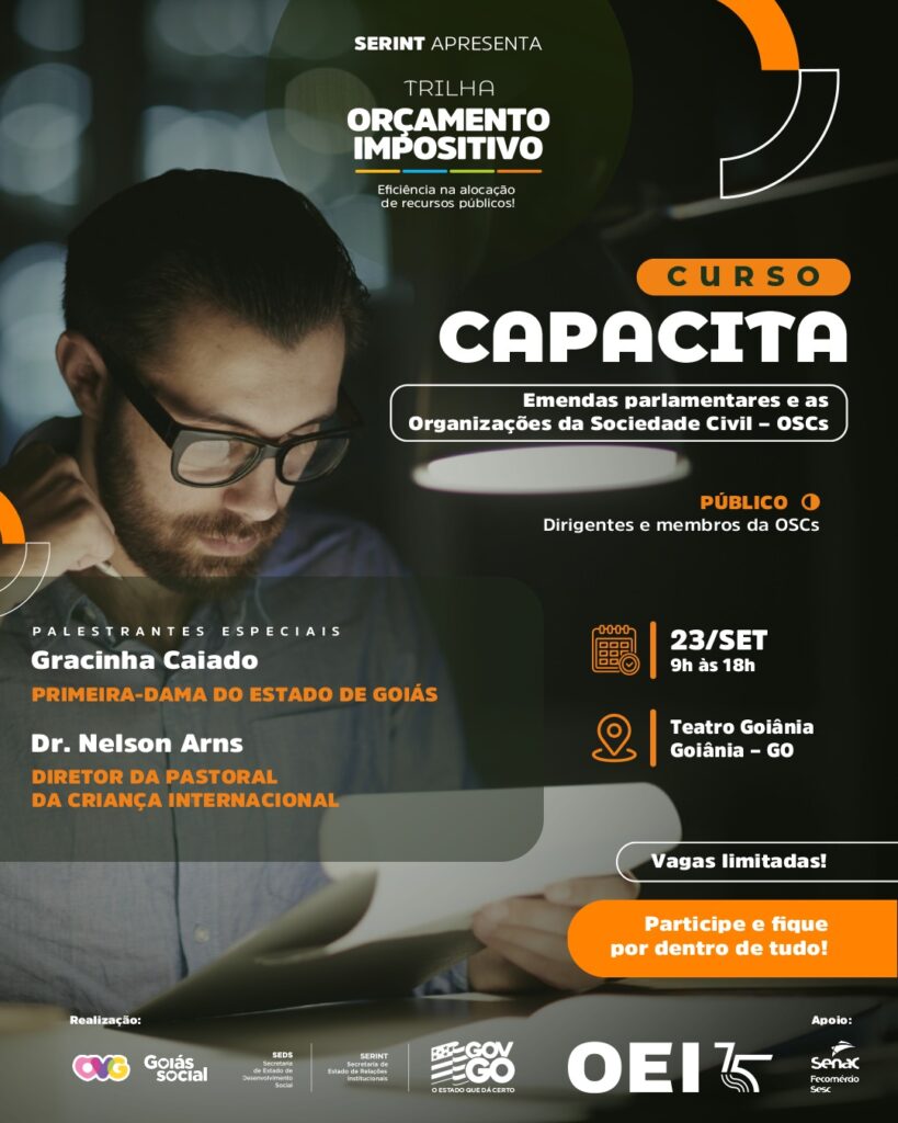 A iniciativa é uma realização das secretarias de Estado de Relações Institucionais (SERINT), de Desenvolvimento Social (SEDS) e a Organização das Voluntárias de Goiás (OVG), em parceria com a Organização dos Estados Ibero-americanos para a Educação, a Ciência e a Cultura (OEI). A capacitação é gratuita e voltada a dirigentes e membros de OSCs. As vagas, no entanto, são limitadas e as inscrições devem ser feitas pela plataforma Sympla – Curso Capacita.