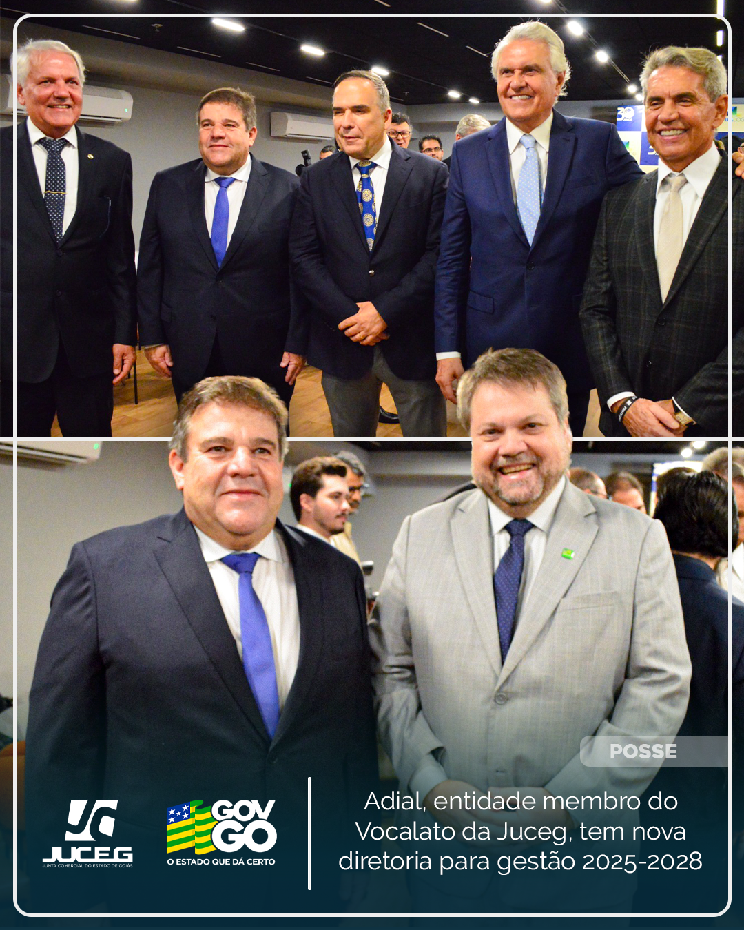 Tomou posse, na noite desta segunda-feira (28), a nova diretoria da Associação Pró-Desenvolvimento Industrial do Estado de Goiás (Adial), uma das entidades com cadeira no vocalato da Junta Comercial (Juceg). O presidente da Juceg, Euclides Barbo Siqueira, prestigiou o evento, assim como o governador Ronaldo Caiado, o vice Daniel Vilela e o prefeito de Goiânia, Sandro Mabel.