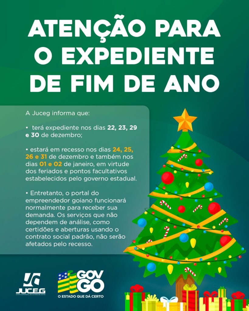 Atenção para o expediente de fim de ano! Última Atualização em 17 de dezembro de 2025 Categoria Notícias ⚠️ Fique atento ao expediente da Juceg durante as festas de fim de ano!