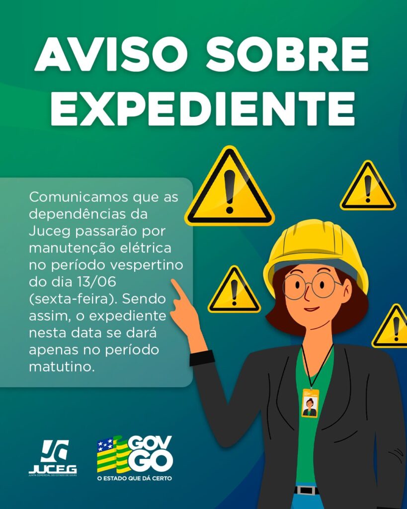 Atenção, usuário dos serviços da Junta Comercial de Goiás! Neste dia 13 de junho, sexta-feira, o atendimento ao público será alterado por conta de serviços de manutenção elétrica. Programe-se!