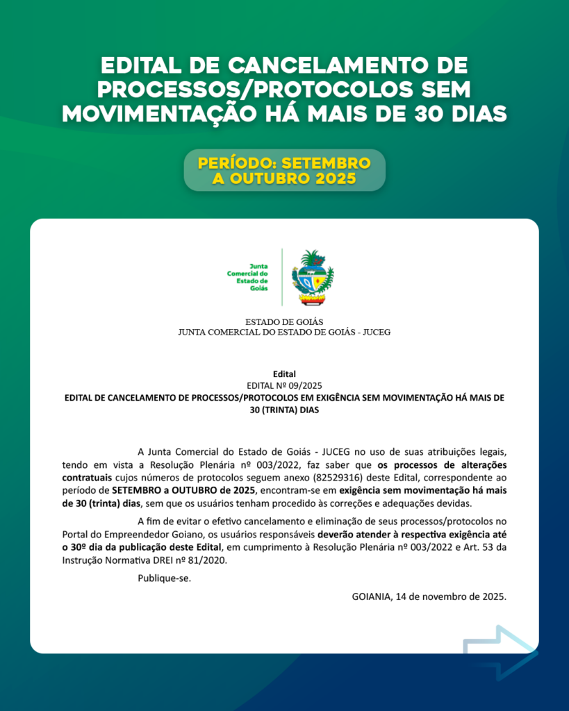 Disponível o Edital de cancelamento de processos/protocolos sem movimentação há mais de 30 dias, referente aos meses setembro e outubro de 2025
