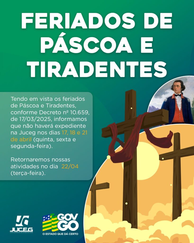 Feriados de Páscoa e Tiradentes Última Atualização em 16 de abril de 2025 Categoria Notícias Atenção para mudanças no expediente da Junta Comercial durante o feriado!