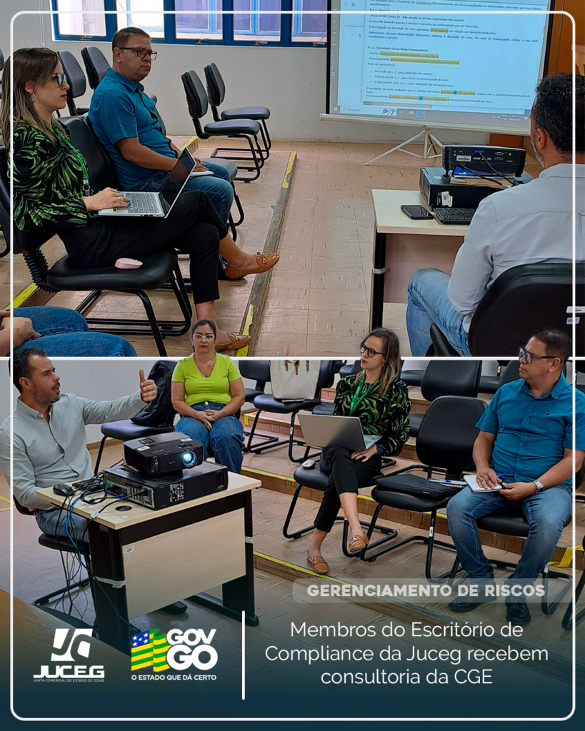 Os servidores da Junta Comercial do Estado de Goiás (Juceg), Adriano Guimarães e Vitória Mendes, membros do Escritório de Compliance da autarquia, receberam, na manhã desta quarta-feira (16), os servidores da Controladoria-Geral do Estado, Rodrigo Silva Goes e Elizângela Abreu Vasconcelos, para consultoria acerca das etapas do gerenciamento de riscos.