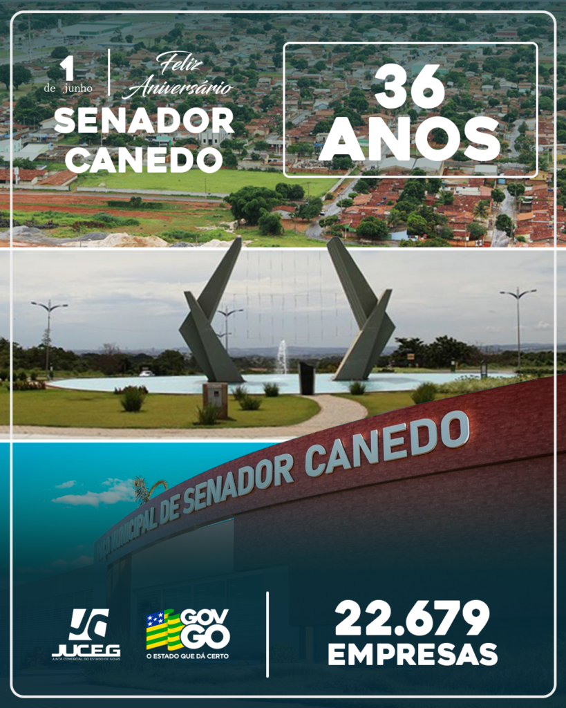 A Junta Comercial de Goiás (Juceg) parabeniza o município de Senador Canedo, que, apesar de jovem, desponta como uma das cidades que mais crescem no Brasil, somando perto de 170 mil habitantes.