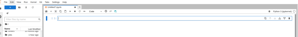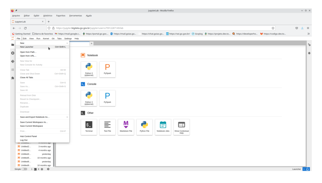 Na tela inicial do Jupyter criar um novo “Launcher”. Isso pode ser feito no menu File->New Launcher,, ou com o botão “+” no topo esquerdo da janela logo abaixo do Menu principal,