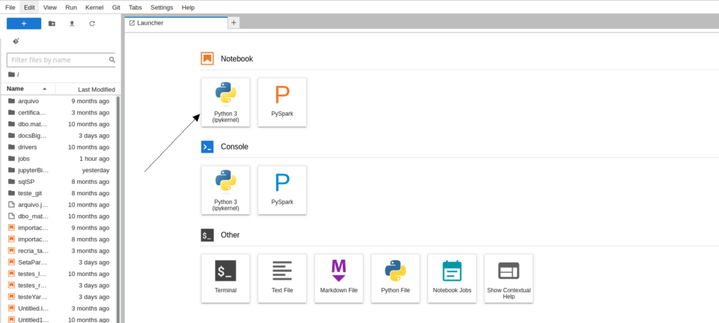 Criar um novo notebook PySpark. Para isso, selecionar “PySpark” na seção “Notebook” do Launcher (criado no passo anterior) como mostrado abaixo: