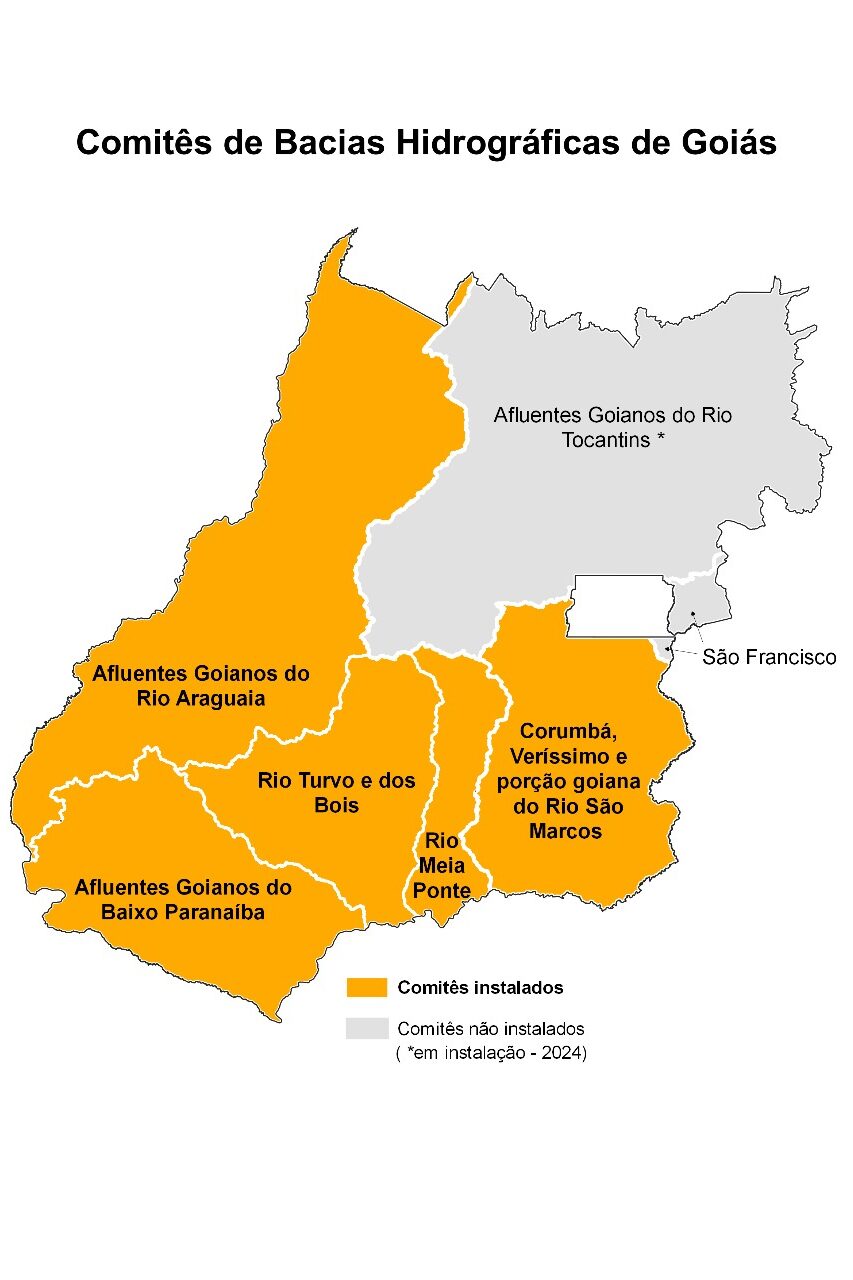No ano de 2025, existem 6 comitês de bacia estaduais criados em Goiás, sendo 5 (cinco) instalados e 1 (um) instituído via Conselho Estadual de Recursos Hídricos.
