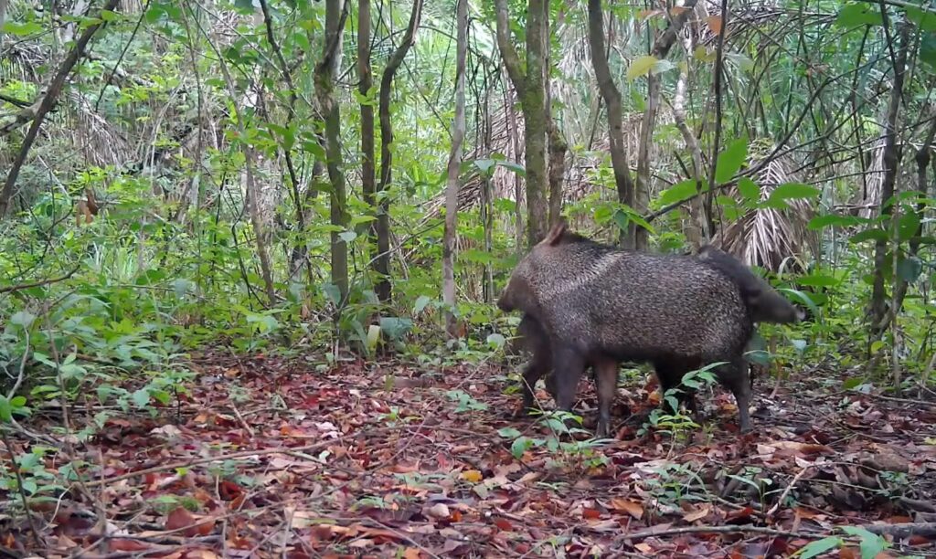 Os catetos (Pecari tajacu) também apareceram em dupla, demonstrando uma interação social típica da espécie, se esfregando uns nos outros para reforçar os elos existentes em seus grupos numerosos. Outro registro de comportamento envolveu um gato-maracajá (Leopardus wiedii), visto afiando as garras em um tronco.