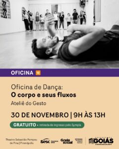 Oficina de Dança: O corpo e seus fluxos Publicado: 30 novembro 2025 Quando 30 de novembro de 2025 09:00 - 13:00 Adicionar ao Calendário Baixar ICS Google Agenda iCalendar Office 365 Outlook Live Onde Theatro Sebastião Pompeu de Pina - Pirenópolis R. Comendador Joaquim Alves, 15 - Centro, Pirenópolis, Goiás, 72980-000 Tipo de Evento Teatro