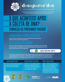 🧬 A coleta de DNA de familiares é uma das principais ferramentas para localizar pessoas desaparecidas em todo o país. O material genético coletado permite o cruzamento de perfis com aqueles armazenados nos Bancos de Perfis Genéticos Estaduais, Distrital e Nacional, onde estão cadastrados perfis de pessoas encontradas vivas e falecidas que ainda não foram identificadas. Esse processo é fundamental para fornecer respostas às famílias e ajudar na solução de casos pendentes de desaparecimento.