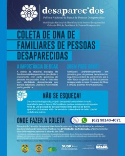 🧬 A coleta de DNA de familiares é uma das principais ferramentas para localizar pessoas desaparecidas em todo o país. O material genético coletado permite o cruzamento de perfis com aqueles armazenados nos Bancos de Perfis Genéticos Estaduais, Distrital e Nacional, onde estão cadastrados perfis de pessoas encontradas vivas e falecidas que ainda não foram identificadas. Esse processo é fundamental para fornecer respostas às famílias e ajudar na solução de casos pendentes de desaparecimento.