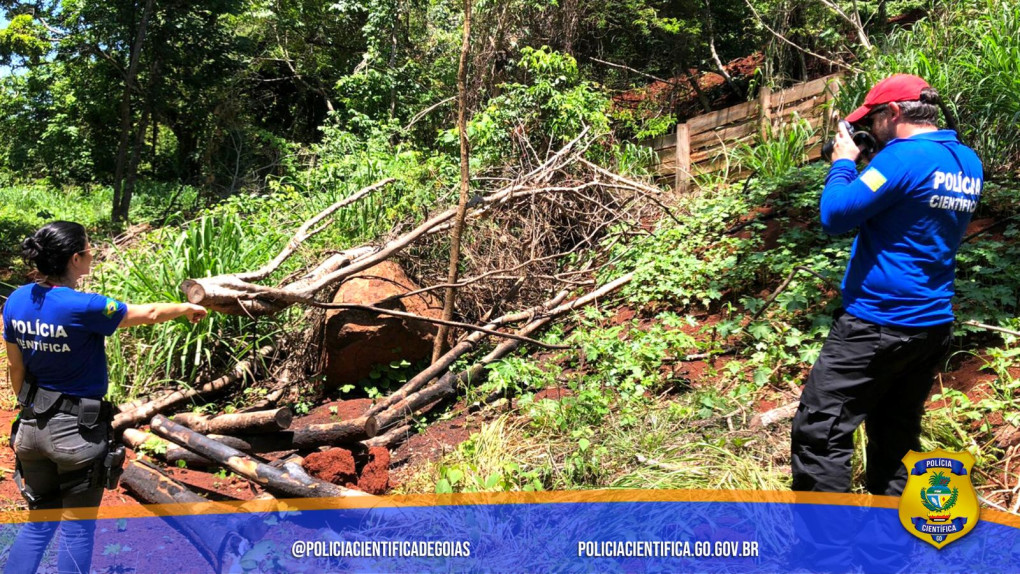 Nas imagens, procedimento realizado pelos Peritos Criminais Carlos Roberto Pereira Filho, Fernanda Lima e Thais Ferreira de Deus Mota, no âmbito da 6ª Coord. Regional de Polícia Técnico-Científica (6ªCRPTC–Ceres): possível Crime Ambiental (possível supressão e queima em Área de Preservação Permanente – APP).
