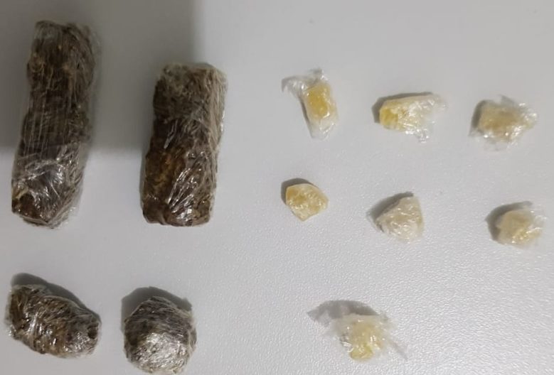 De imediato, os investigadores se dirigiram ao endereço de Adriano. Realizada a busca domiciliar, os investigadores localizaram quatro porções de material suspeito de se tratar de maconha e sete pedras de produto assemelhado a crack, embaladas e prontas para serem comercializadas. Além disso, a equipe policial também encontrou o facão utilizado para o cometimento do roubo.