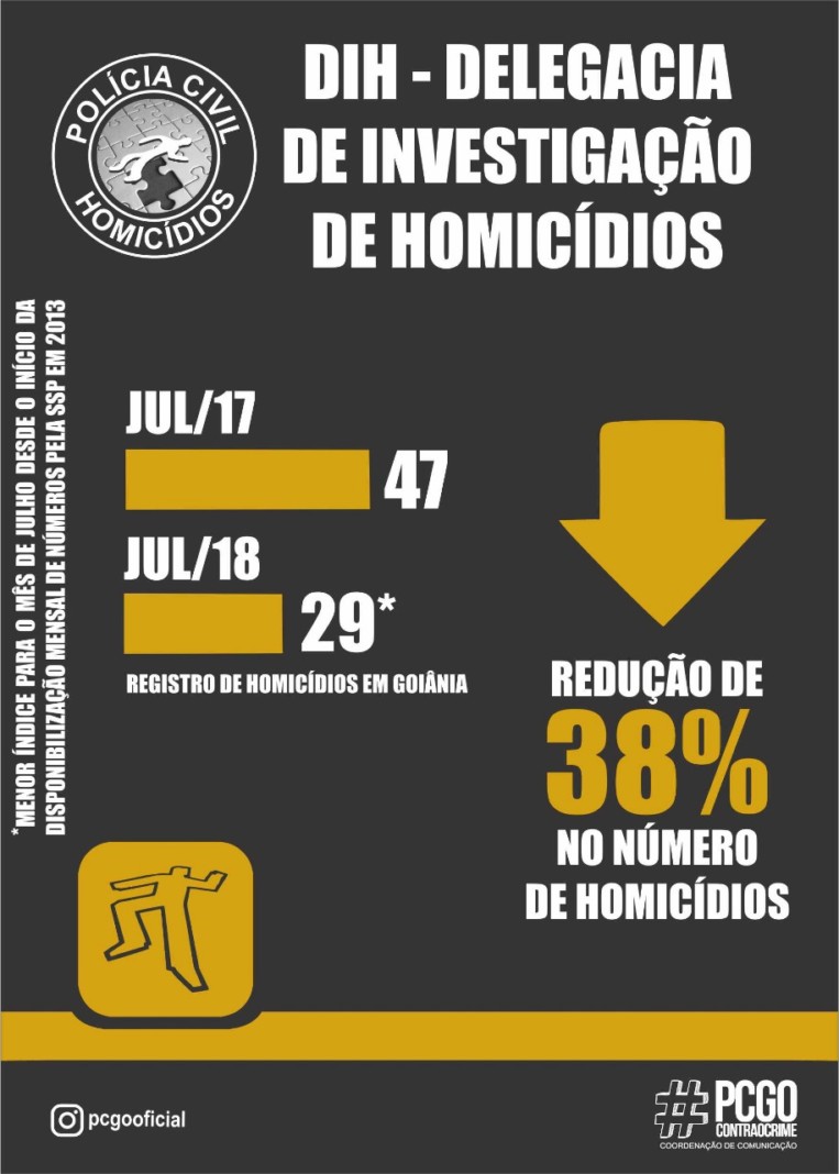 A Delegacia Estadual de Investigação de Homicídios (DIH) divulgou nesta semana os números de casos de homicídios registrados em Goiânia nos dois primeiros trimestres deste ano e, também, no mês de julho. Em todos os cenários as cifras apontam para a redução de crimes o que, conforme frisa o delegado Thiago Damasceno, é resultado das ações empreendidas pela Especializada. “São vários fatores que levam a essa redução, mas certamente um deles é a atuação da DIH, que vem produzindo em ritmo acelerado, ora mediante grandes operações, ora por meio de representações e cumprimentos de mandados de prisão”, comentou.