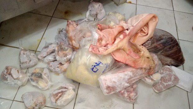 Entre as irregularidades, foi encontrado contêiner enferrujado na segunda câmera fria, onde carnes diversas eram acondicionadas, e ainda, expositores com borrachas sem aderência, que não mantinham a temperatura adequada, nem evitavam o contato com insetos. Além disso, foram encontradas carnes picadas acondicionadas em caixas inadequadas, expostas a insetos, sendo secadas através da liberação do calor do compressor de ar condicionado. Essas carnes eram comercializadas em embalagens plásticas, sem etiqueta que identificasse origem e data de validade.