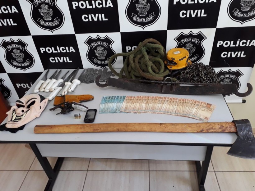 Após investigações, a autoridade policial deliberou por representar, junto ao juízo local, pela concessão de medidas cautelares aptas a confirmar a existência dos crimes e participação dos investigados. Durante a prisão dos suspeitos, os policiais encontraram grande numerário em dinheiro, uma máscara, instrumentos utilizados para o abatimento de semoventes e um revólver calibre 22 com munições na residência de Flávio, o qual foi autuado em flagrante delito pelo crime de posse ilegal de arma de fogo de uso permitido.