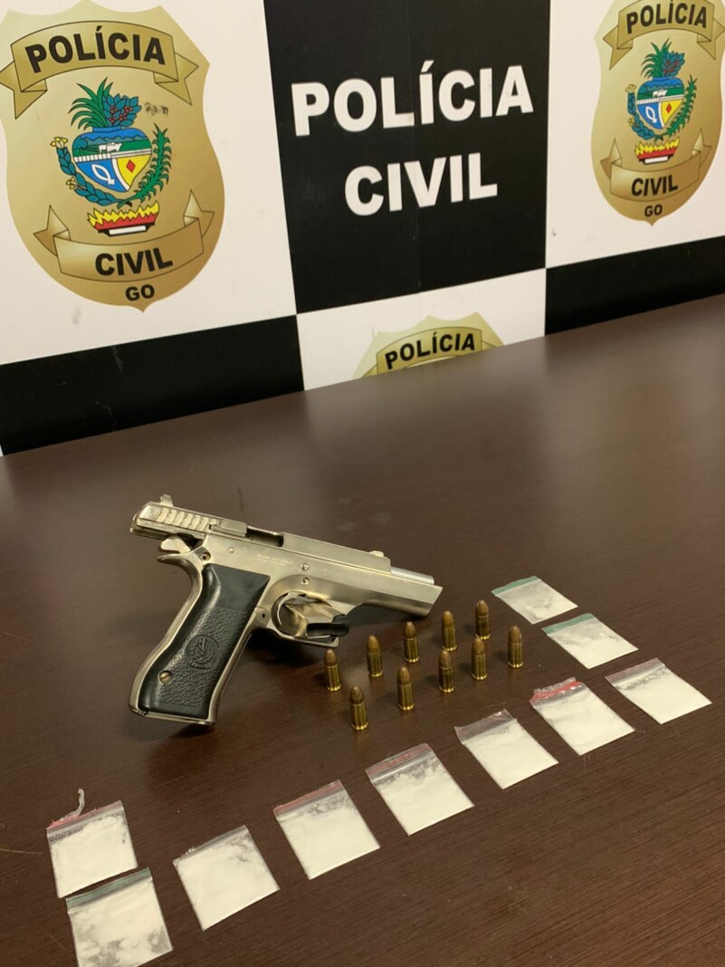 De acordo com denúncia recebida pela Denarc, o investigado estaria vivendo do tráfico de drogas varejista após ter tido seus bens bloqueados por ordem judicial, mantendo em sua residência drogas e arma de fogo ilegal. Após diligências de campo, os policiais descobriram que o investigado estava escondido em um hotel, na cidade de Abadia de Goiás, onde foi preso pelo cumprimento de mandado de prisão preventiva que estava aberto. A equipe da Denarc ainda se deslocou até a residência do alvo, localizada no Setor Vera Cruz, em Goiânia, onde apreendeu porções de cocaína preparadas para venda, além de uma pistola de origem israelense calibre 9 mm, o que ensejou a prisão em flagrante por estes crimes.