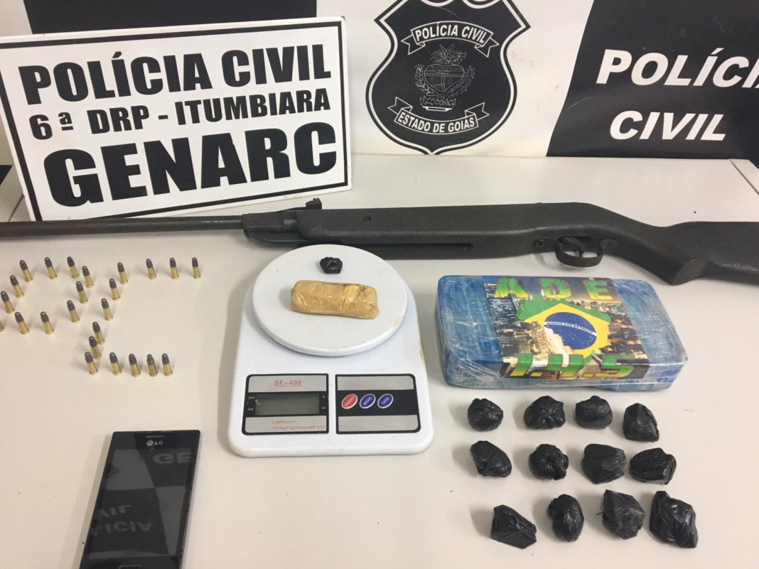 Policiais Civis do Grupo Especial de Repressão a Narcóticos (Genarc) de Itumbiara, coordenados pelo delegado Rogério Moreira, prenderam em flagrante Wilson Antônio dos Santos, 45 anos, em posse de grande quantidade de drogas, além de arma de pressão adaptada para disparar no calibre 22 e das respectivas munições no Bairro São João. A ação se deu na tarde de sexta-feira (17).