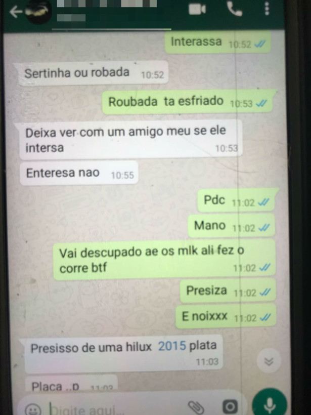 Em uma das mensagens trocados pelo aplicativo WhatsApp, Hugo oferece ao interlocutor um veículo Ford/F1000, o qual havia sido roubado recentemente, mas já estava sendo “esfriado” em outro local, o que foi comprovado pelas fotos enviadas. “Chamou a atenção da Polícia uma das mensagens em que uma pessoa encomenda a Hugo uma Hilux, ano 2015, placa inicial P, devido a facilidade de negociação no mercado negro”, afirmou Teófilo.