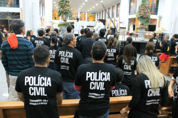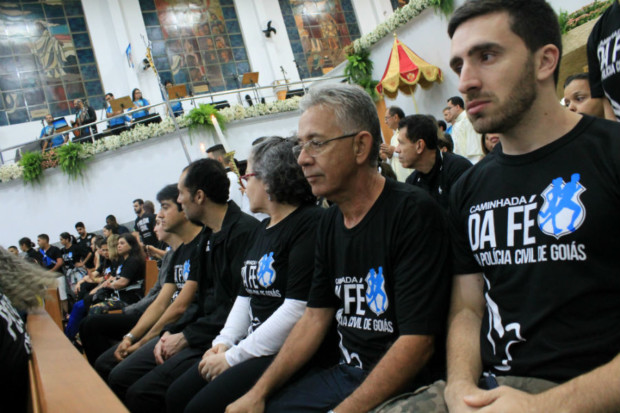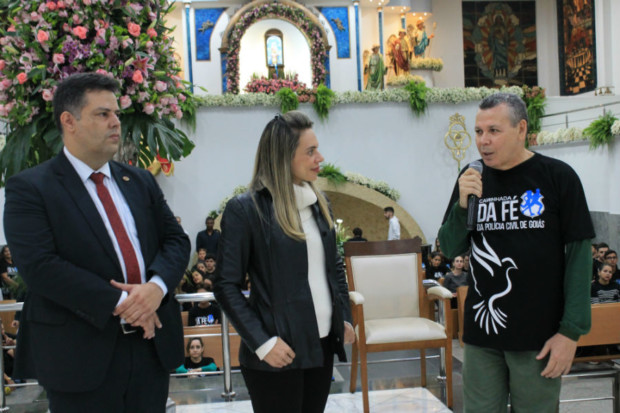 O delegado-geral da Polícia Civil de Goiás, Álvaro Cássio dos Santos, o delegado supervisor e vereador Eduardo Prado e a delegada Renata Freitas foram recebidos no altar. Em seu discurso, Álvaro Cássio enalteceu a importância da fé religiosa para os policiais civis, tendo em vista as características da profissão. “Estamos aqui hoje para agradecer a Deus pelo fato de podermos exercer nossa profissão, de muitos riscos, com dignidade e integridade das nossas próprias vidas e de nossos familiares”, salientou.