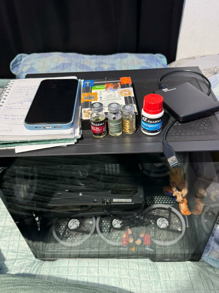Durante as investigações, a PC tomou conhecimento de que o suspeito atuava na falsificação de medicamentos emagrecedores. Para tanto, contava com o apoio de um amigo que é personal trainer na cidade. Portanto, em conjunto com a prisão preventiva pelos crimes de registro e divulgação não autorizada dos atos sexuais, foram cumpridos três mandados de busca e apreensão, sendo dois deles nas duas residências do investigado e um mandado de busca e apreensão na residência do personal trainer.