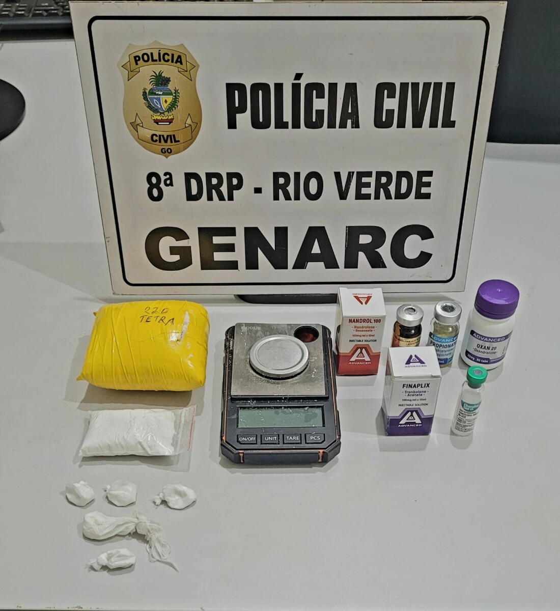Nesta quinta-feira (14), a Polícia Civil, por meio do Grupo Especial de Repressão a Narcóticos (Genarc) de Rio Verde, deflagrou a Operação Pré-Treino, com o objetivo de combater o tráfico de drogas e a venda e aplicação ilegal de anabolizantes na cidade. Durante a operação, um personal trainer e um músico foram presos. Após investigações, a Polícia Civil identificou que o personal trainer, que atuava em academias renomadas da cidade, comercializava e aplicava anabolizantes de forma clandestina e fornecia cocaína a alguns de seus alunos/clientes. A prática de aplicação dos anabolizantes ocorria em estacionamentos das academias e na residência do suspeito, em desrespeito às normas legais e sanitárias.