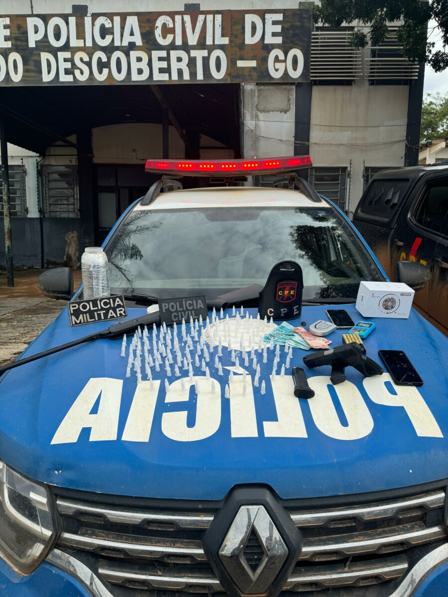Durante o cumprimento dos mandados hoje, os policiais encontraram 150 pinos de cocaína, uma balança de precisão, R$ 1 mil em espécie, uma pistola calibre 9mm (registrada em nome do investigado) e uma espingarda de pressão com suspeita de modificação para calibre .22. As substâncias entorpecentes foram localizadas dentro de um cano na cisterna. Por este motivo, o autor do homicídio foi também autuado em flagrante por tráfico de drogas.