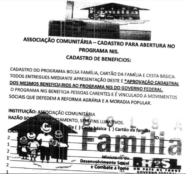 Durante a abordagem, foram encontradas em seu poder fichas cadastrais de uma associação comunitária com símbolos programas oficiais. Segundo Francisley, as fichas eram usadas para registrar interessados. O investigado cobrava de R$ 30 a R$ 100 mensais por um período de até seis anos. Ele negou a prática do crime de estelionato. Afirmou que Adalberto era um nome de assentado (assentamento em terras devolutas). Confirmou que recebia os valores das pessoas cadastradas e usava os valores para custear as despesas da associação.