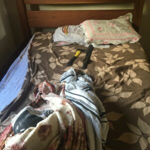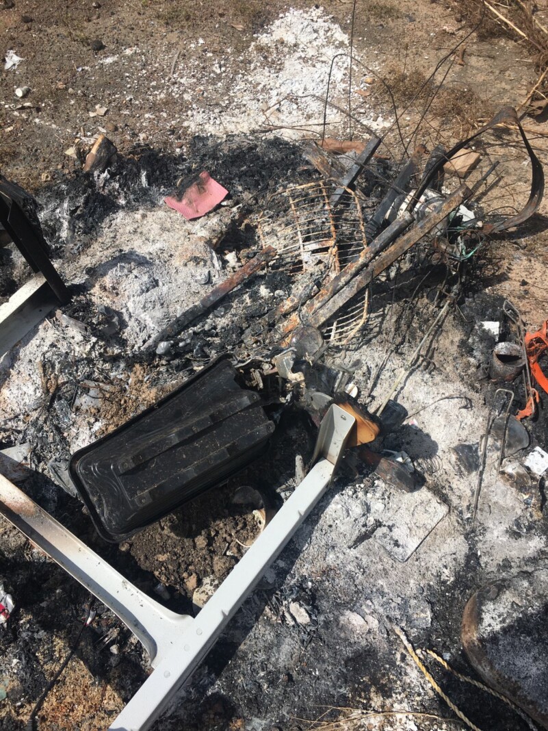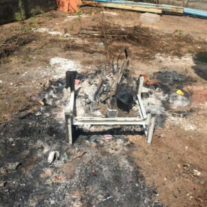 A equipe da Polícia Civil, durante diligência para retirada dos pertences pessoais da vítima na residência onde moravam, constatou que as roupas dela, de seus filhos, documentos pessoais e uma máquina de costura utilizada por ela haviam sido incinerados no quintal, sendo possível sentir o calor e o forte odor de álcool que emanava das cinzas dos objetos incendiados. Foram encontrados, sobre a cama do casal, uma machadinha e um facão devidamente afiados. Segundo a vítima, no dia anterior, o agressor teria se dirigido até a residência de sua mãe, onde ela estava morando, ordenando para que ela fosse até o lar conjugal buscar suas coisas. O agressor ainda proferiu insultos contra a vítima. A autoridade policial, além do flagrante, representou pela prisão preventiva do agressor.