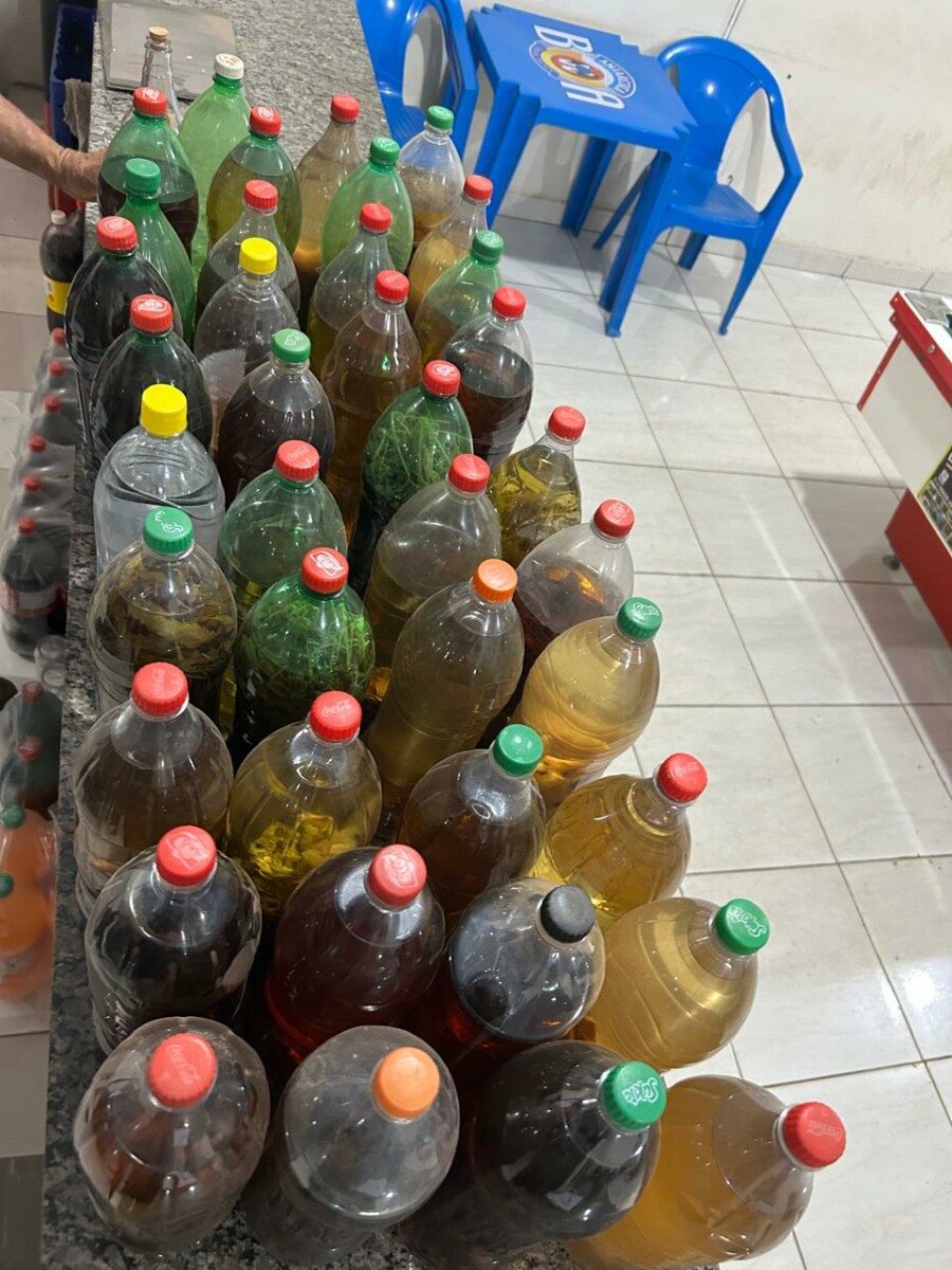 Foram apreendidas 13 unidades de destilados sem registro no Ministério da Agricultura, além de 42 garrafas pet contendo bebidas artesanais. Duas amostras foram encaminhadas à Polícia Científica para análise laboratorial. A operação resultou ainda em cinco autos lavrados, sendo três termos de inutilização e dois autos de infração, consolidando o caráter preventivo e fiscalizatório da ação.