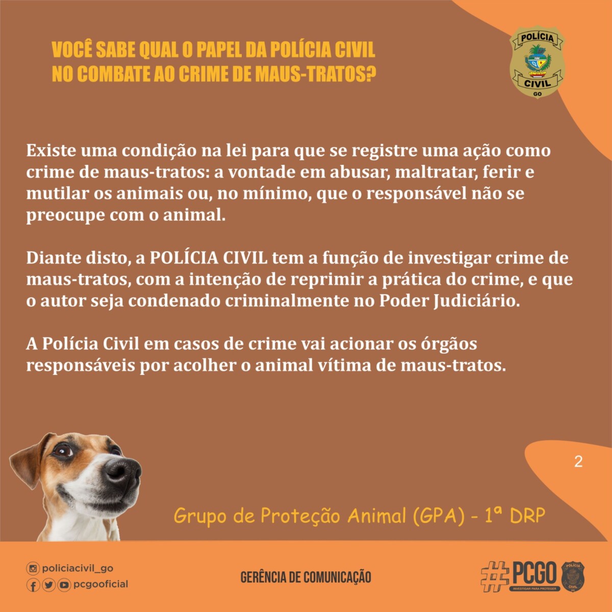 PCGO lança cartilha de orientação contra os maus-tratos animais Publicado em 3 abril 2024 Última Atualização em 3 de abril de 2024