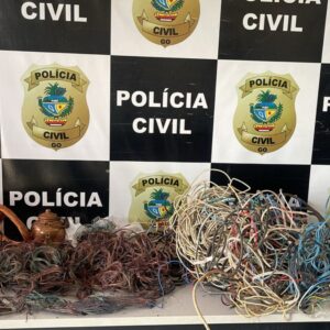 Durante diligências investigativas, os policiais civis constataram que o conduzido mantinha em depósito, no interior de estabelecimento comercial de sua propriedade, aproximadamente 40 quilos de fios de cobre já sem o revestimento isolante, de diversas bitolas, material compatível com aquele subtraído de estruturas públicas destinadas ao fornecimento de energia elétrica.